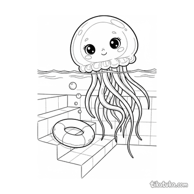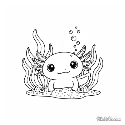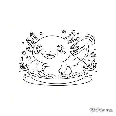 Esta sección reúne 165 páginas de ajolotes kawaii en ambientes acuáticos: cuevas submarinas, jardines de algas, piscinas con aros inflables y escenas de té sobre nenúfares gigantes. El estilo kawaii se mantiene coherente en toda la colección, con personajes de rasgos redondeados y escenas pensadas para niños que disfrutan de los animales del agua y la fantasía marina.