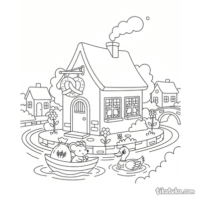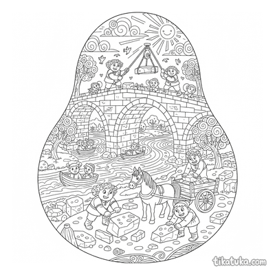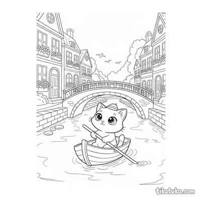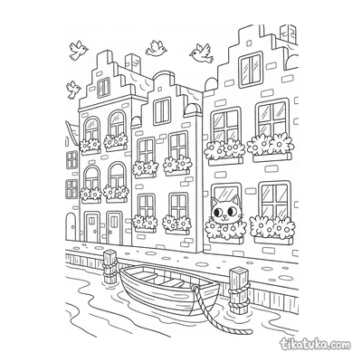 La colección de arquitectura incluye 153 láminas organizadas por tipo de construcción y ambientación. Hay puentes de distintas épocas y materiales, desde arcos de piedra antigua hasta estructuras sobre ríos con ciclistas; castillos medievales con jardines, fuentes y fiestas en el patio; faros costeros en acantilados; y pintorescos barrios de canales con botes y gatos exploradores. Las escenas no son vistas vacías: siempre aparece un personaje en acción que le da vida al espacio y sugiere una historia que completar.