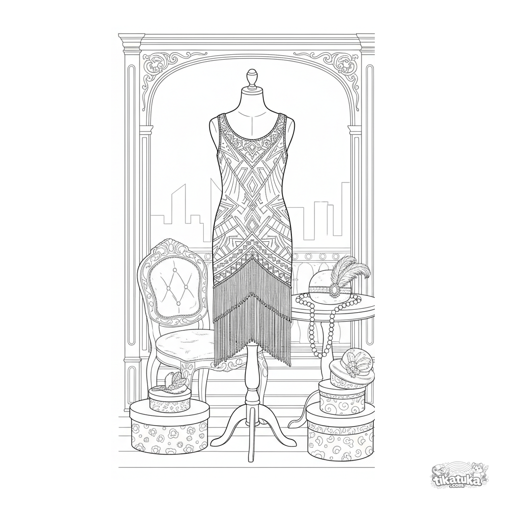 Página para colorear detallada para 10-12 años: un vestido flapper de los años 20 en un maniquí de escaparate. Muchos patrones, flecos y accesorios vintage para colorear.