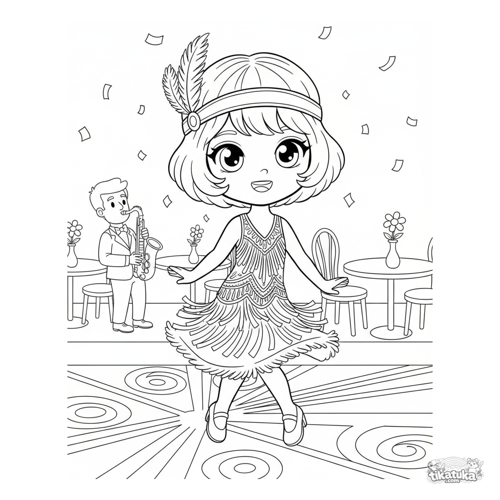 Página para colorear para niñas 10-12: una chica en un vestido flapper de los años 20 gira alegremente en la pista de baile de un speakeasy.