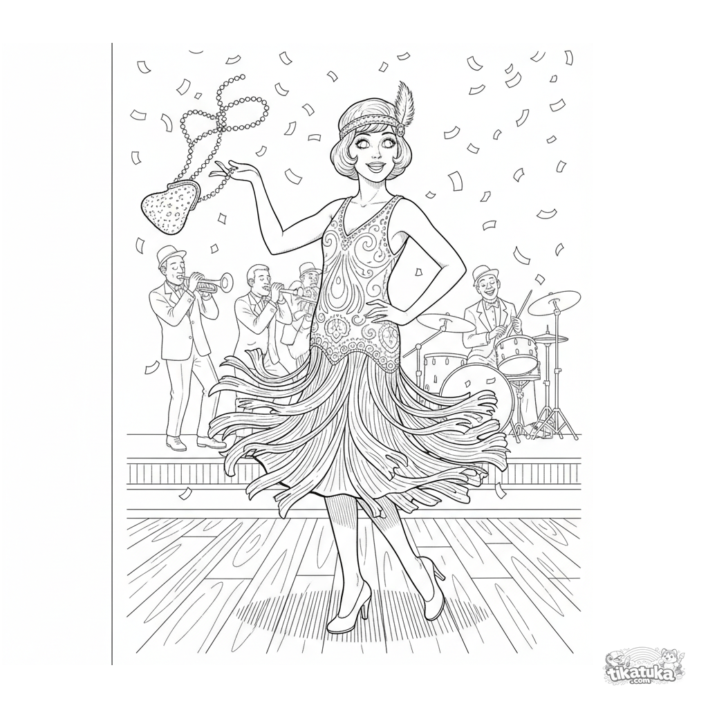 Página para colorear compleja para 10-12 años: chica en vestido flapper de los años 20 girando en pista de baile secreta. Escena dinámica con banda, confeti y detalles históricos.