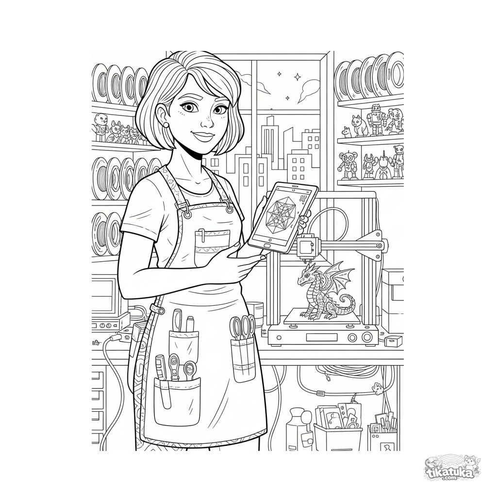 Página para colorear para niños de 10-12 años: un operador observa una impresora 3D en funcionamiento en un sótano de hackers. Detalles: carretes de filamento, impresiones terminadas, tableta con diseño, banco de trabajo.