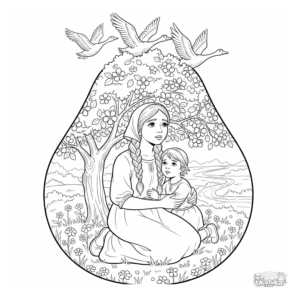 Página para colorear de 'Gansos-cisnes': Alyonushka escondiéndose con su hermano bajo un manzano. Para 5-9 años. Escena del bosque con gansos volando.