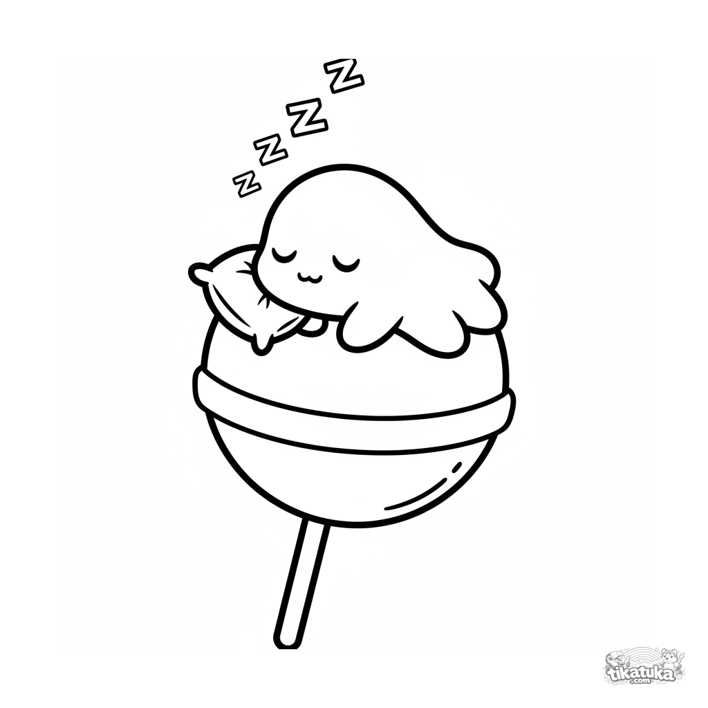 Página simple para colorear para niños pequeños 2-3: una linda ameba burbuja duerme profundamente en la superficie de una piruleta grande. Formas grandes, márgenes amplios.