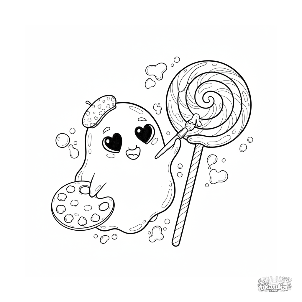 Página para colorear detallada para niños mayores de 10-12 años: un microbio ameba pintor crea arte en la superficie de un pirulito de cristal. Estilo acuarela-esbozo.