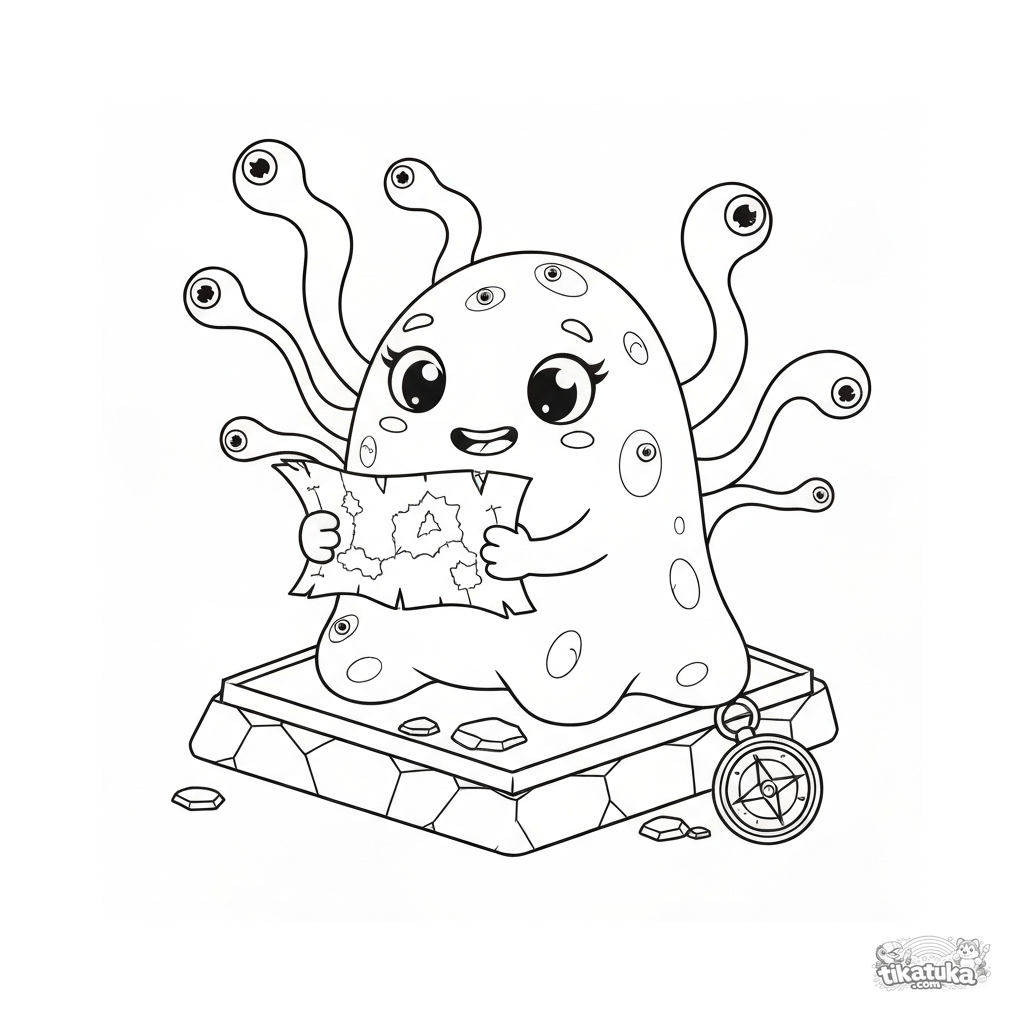 Página para colorear para niños. Ameba amigable con pseudópodos, ojos, mapa del tesoro y brújula en portaobjetos de microscopio. Descarga gratis.