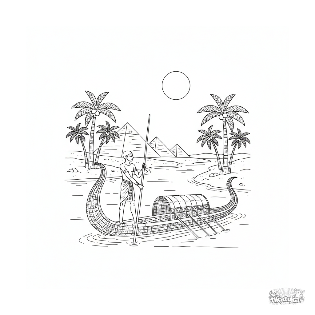 Página para colorear detallada para niños mayores de 10-12 años: una barca de papiro del Antiguo Egipto en el río Nilo. Escena histórica intrincada.