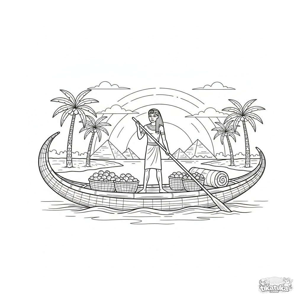 Página para colorear para preadolescentes 7-9: un antiguo barco de papiro egipcio navega por el Nilo al atardecer. Figura con pértiga, cestas de dátiles y pirámides a lo lejos.