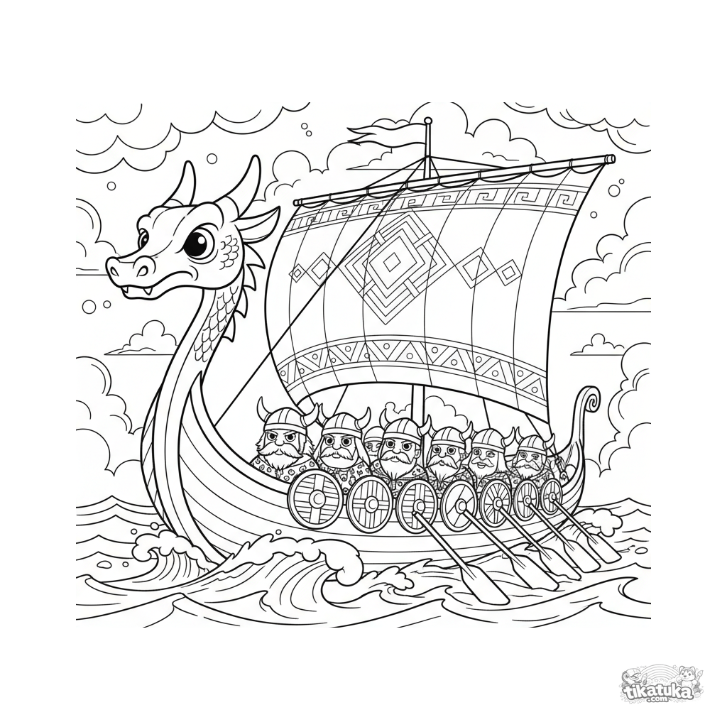 Página para colorear detallada para niños mayores de 10-12 años: un antiguo barco vikingo con proa de dragón navega por un mar nórdico tormentoso. Guerreros reman, escudos en el costado.