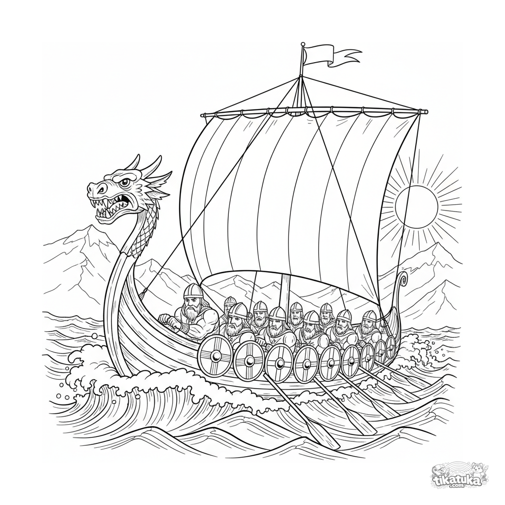 Página para colorear para preadolescentes 7-9: un barco vikingo con proa de dragón navega por un mar agitado. Guerreros reman, escudos en los costados. Escena dinámica.
