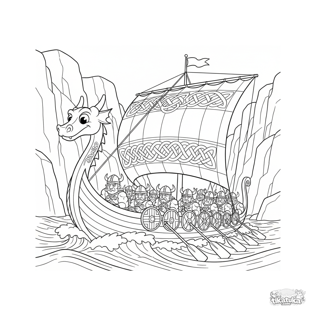 Página para colorear detallada para niños mayores de 10 a 12 años: un barco vikingo desafiando un fiordo tormentoso. Escena dinámica al estilo cómic de aventuras.