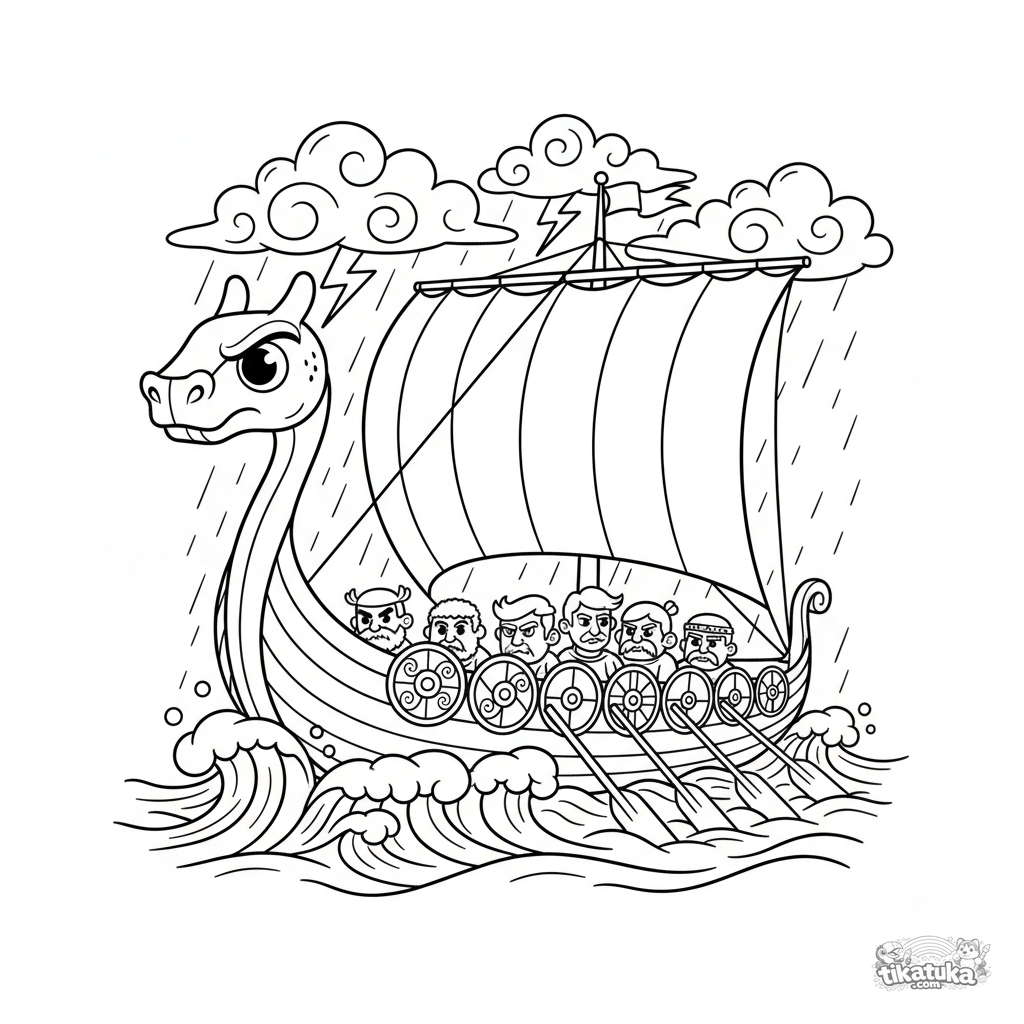 Página para colorear para preadolescentes 7-9: un fiero barco vikingo navega por un mar tormentoso. Escena dinámica con escudos y olas.