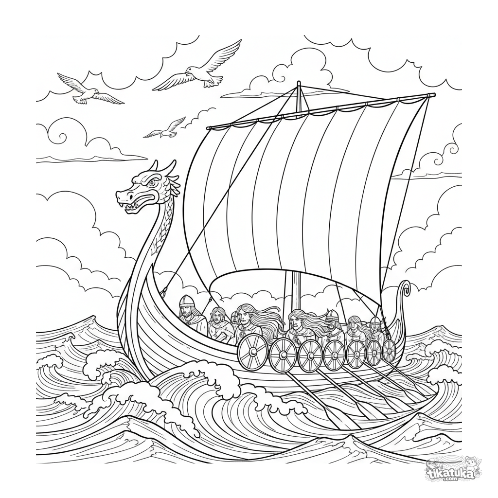 Página para colorear para preadolescentes 7-9: un antiguo barco vikingo con proa de dragón navega en un mar tormentoso.