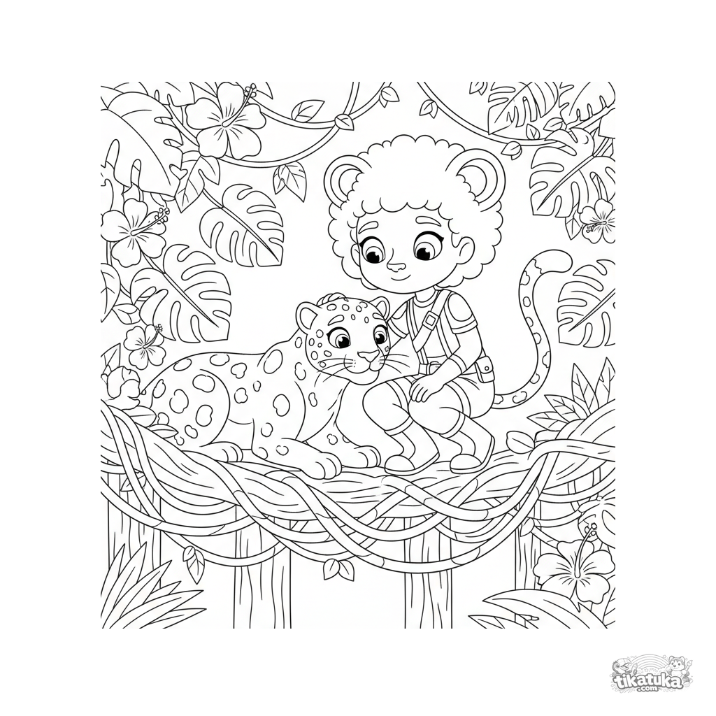 Página para colorear para niños 4-6: un superhéroe con rasgos de jaguar y un compañero jaguar en lianas de la selva tropical.