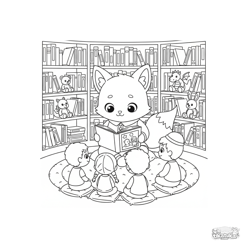 Página para colorear de un superhéroe amable con rasgos de zorro leyendo un libro a niños. Para niños de 4 a 6 años.