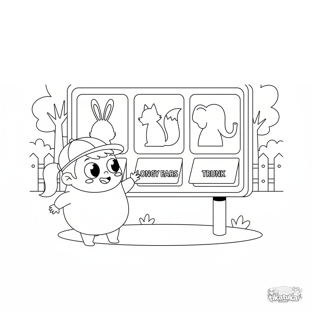 Página para colorear para niños 4-6: un niño juega a 'Adivina el animal por su silueta' en un panel interactivo del zoológico. Escena educativa y atractiva para desarrollar la observación.
