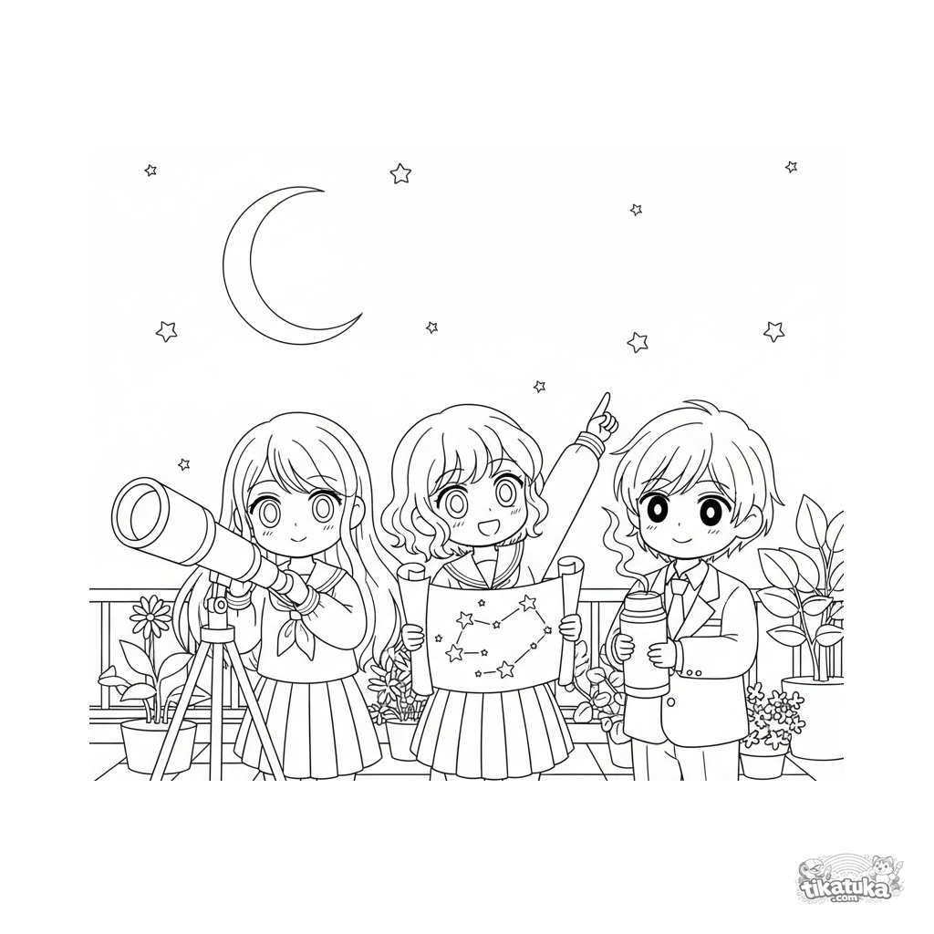 Página para colorear detallada estilo anime para 10-12 años: miembros del club de astronomía escolar observan las estrellas desde la azotea al anochecer.