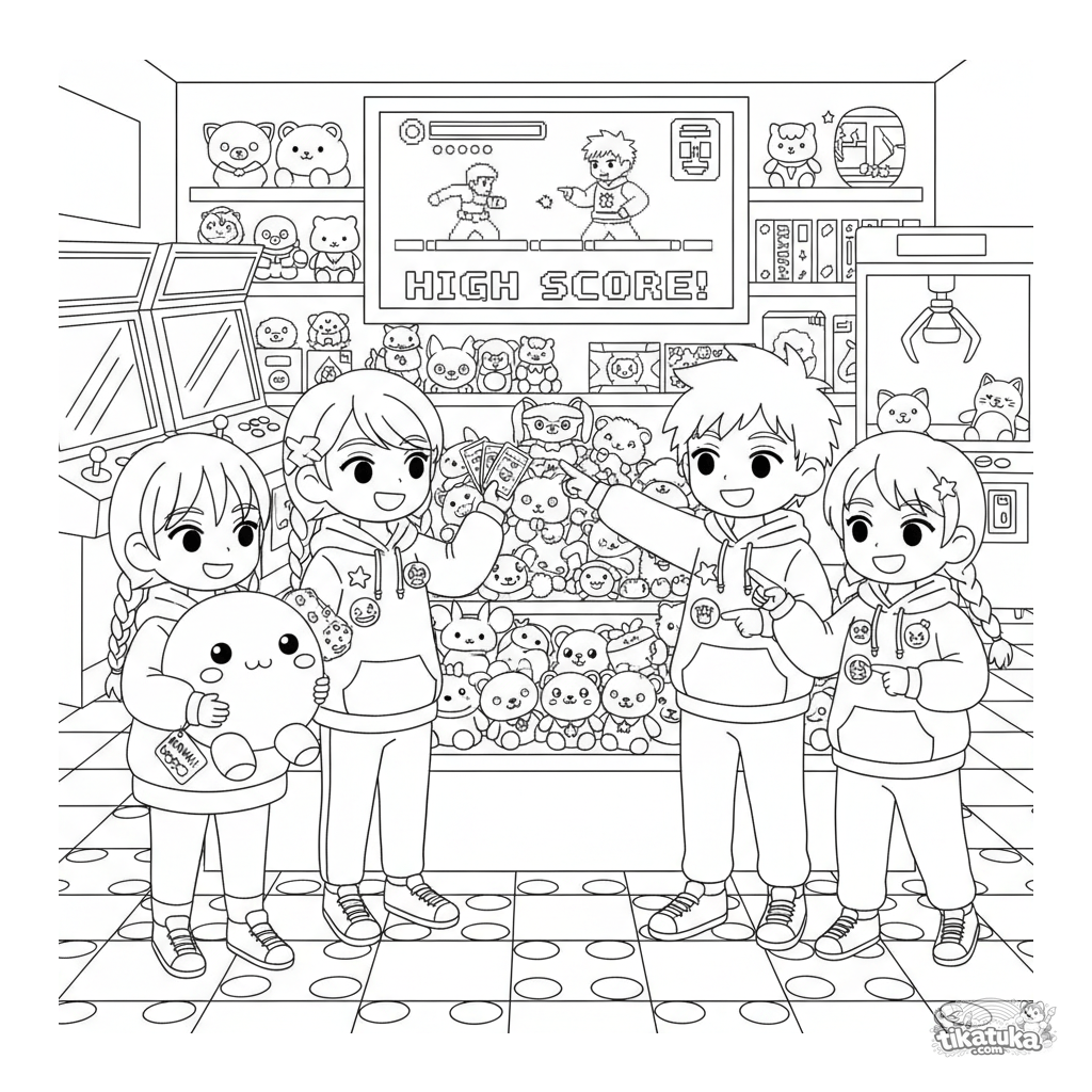 Página para colorear para niños de 7-12 años: un grupo de amigos de un club de anime charlando en el mostrador de premios de un arcade. Escena detallada con peluches, tickets y pantallas.