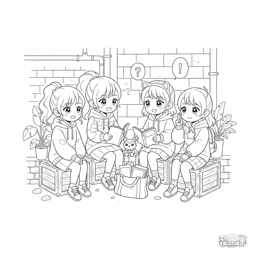 Página para colorear para niños de 7-12 años: amigos de un club de anime compartiendo manga y charlando en un callejón urbano con texturas.