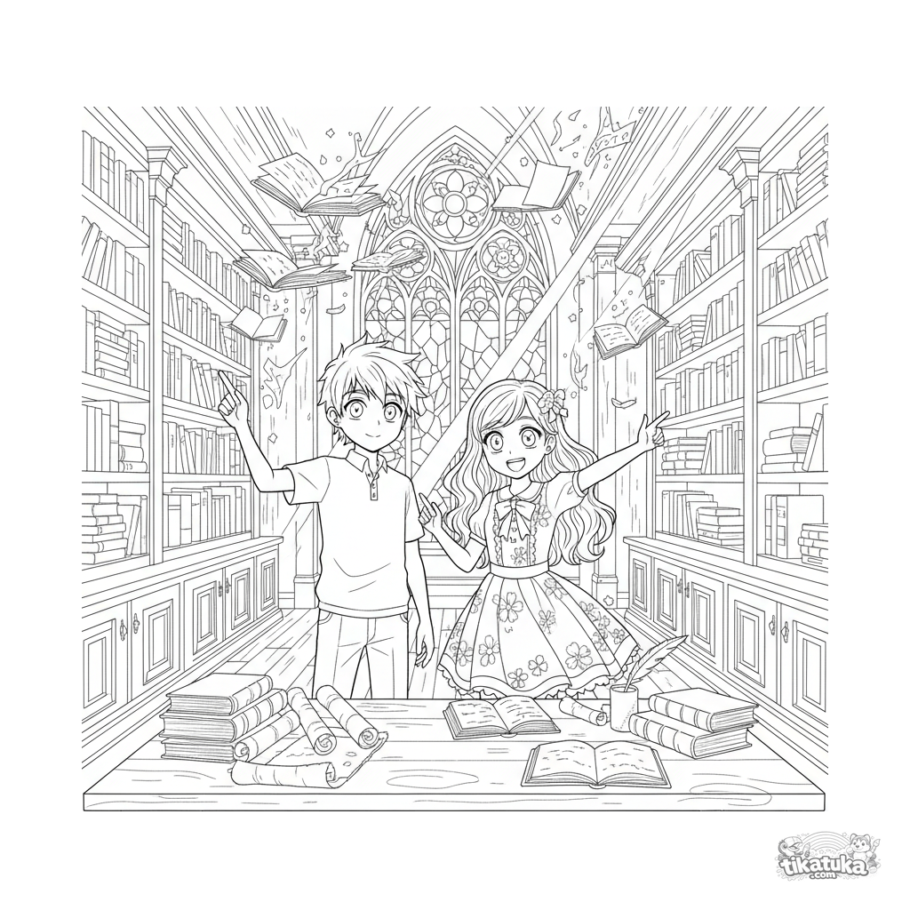 Página para colorear anime detallada: dos estudiantes exploran una biblioteca mágica antigua con libros flotantes. Escena compleja con estantes altos, una vidriera y muchos detalles para 10-12 años.