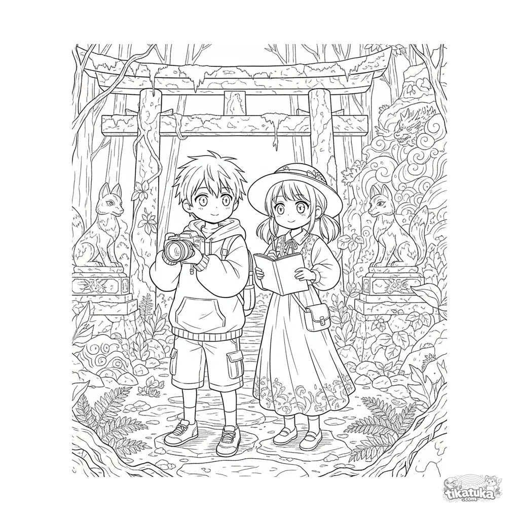 Página para colorear anime kodomo: dos amigos exploran un santuario antiguo cubierto de vegetación. Escena detallada con puerta torii y estatuas para 10-12 años.
