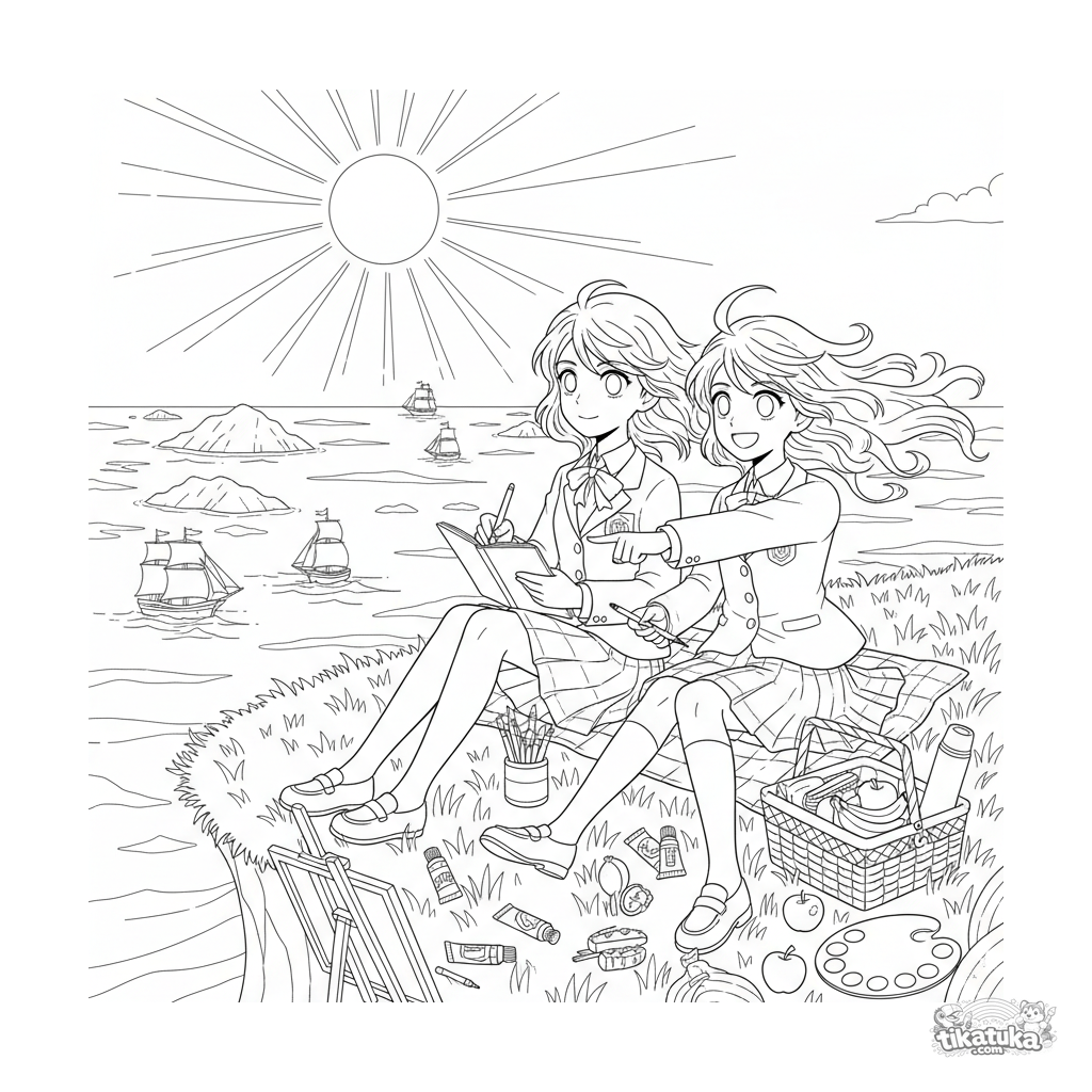 Compleja página para colorear estilo anime para 10-12 años: dos estudiantes con uniforme dibujan en sus cuadernos en un acantilado con vista al océano infinito y veleros.
