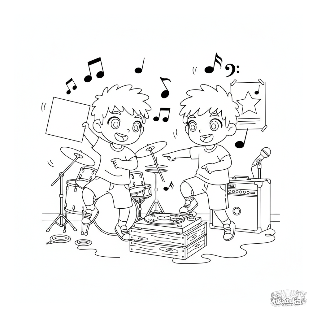 Página para colorear para niños 6-9 en estilo anime: niños alegres bailan en un garaje con un tocadiscos de vinilo.