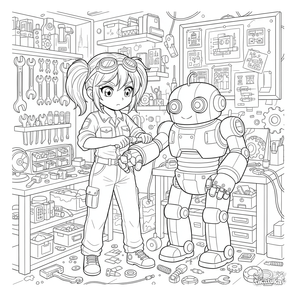 Página para colorear estilo anime para 10-12 años: una chica mecánica repara un robot grande en un taller detallado lleno de herramientas y planos.