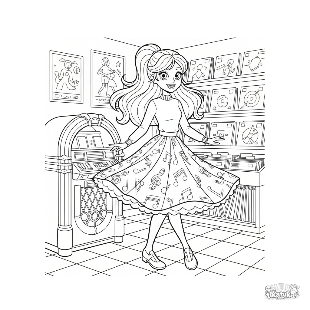 Página para colorear estilo anime shojo para 10-12 años: chica en falda circular de los 50 gira en tienda de discos vintage con fondo detallado.