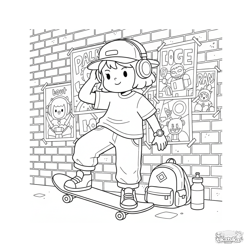 Página para colorear estilo anime shonen para niños de 7 a 12 años: skater en pose relajada en un callejón urbano detallado. Escena dinámica y con estilo.