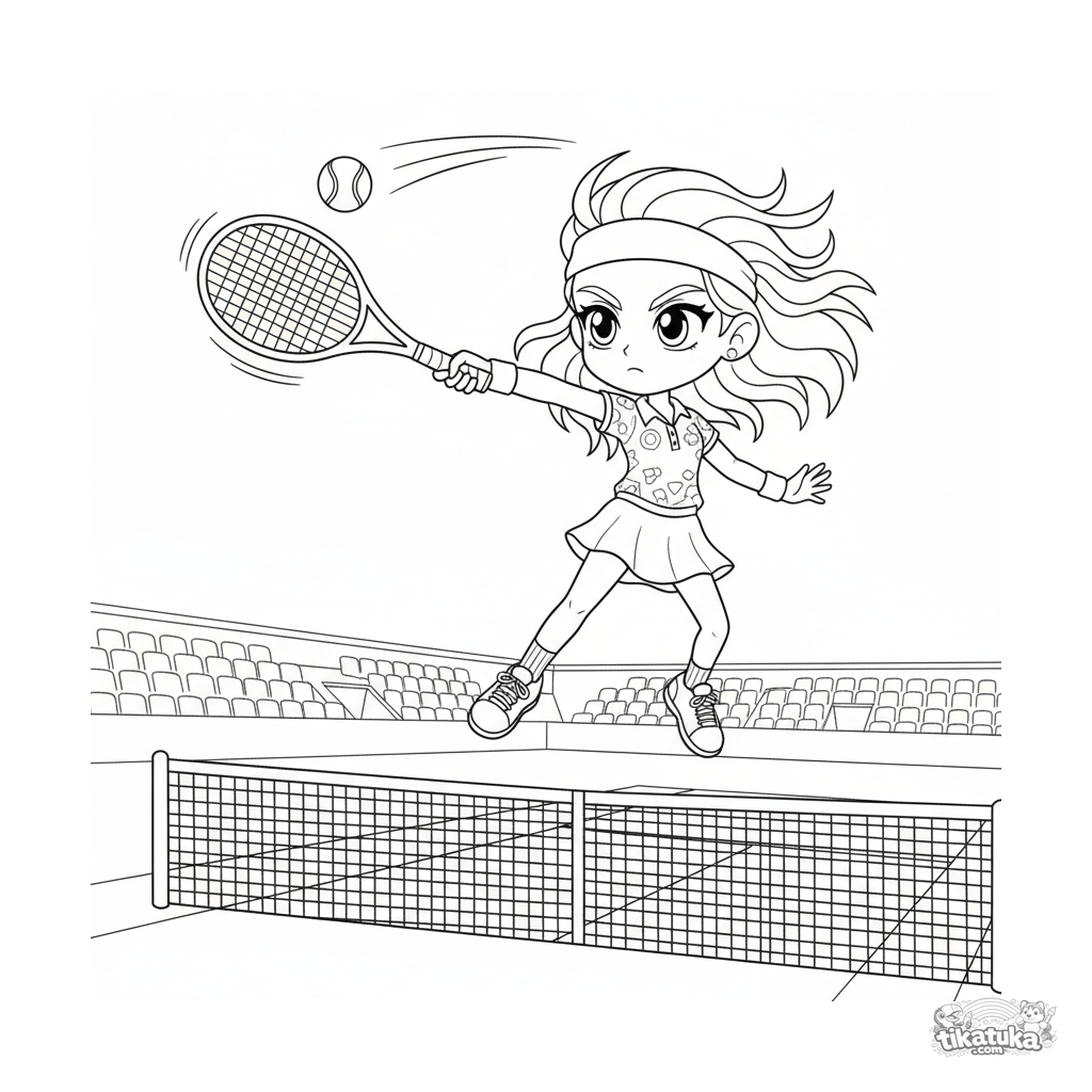 Página para colorear estilo anime para niños mayores de 10-12 años: un tenista en un salto potente en la red para una volea. Líneas enérgicas.