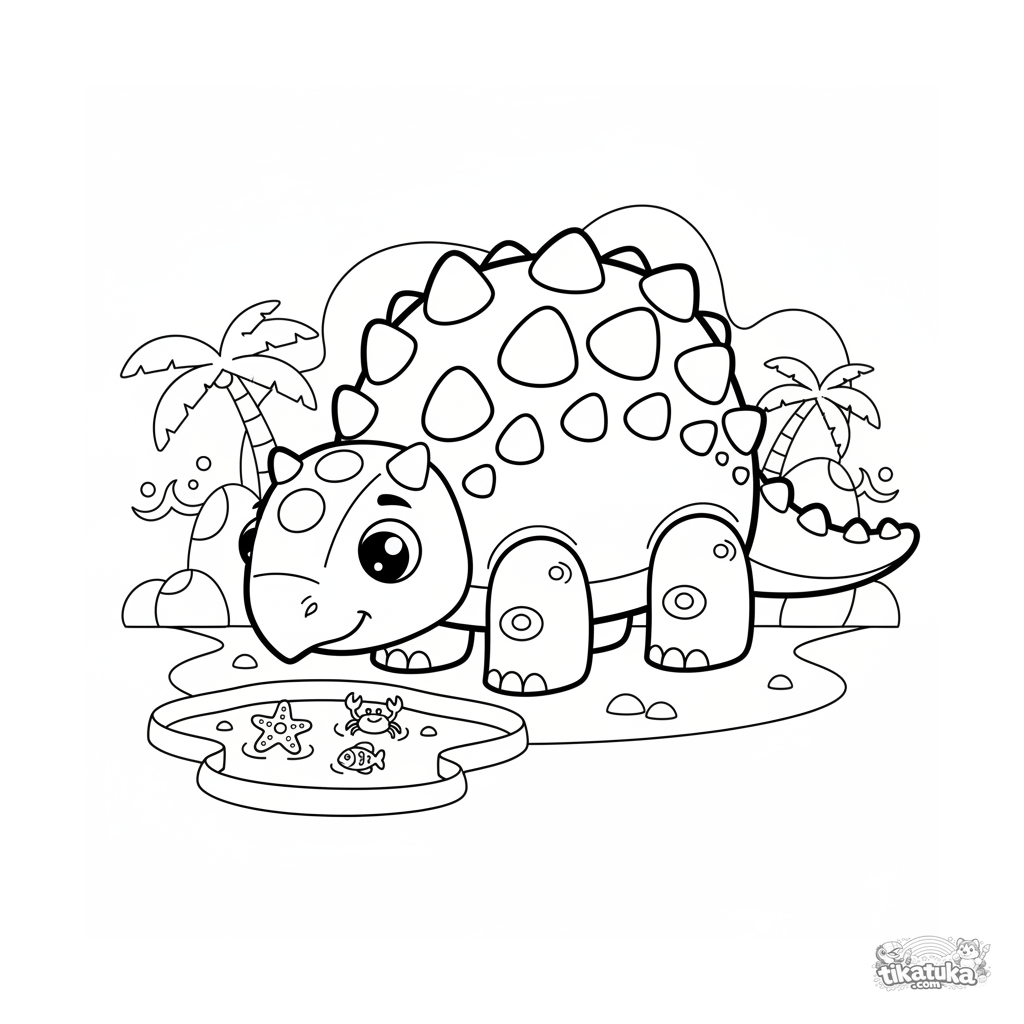 Página para colorear para preadolescentes 7-9: un anquilosaurio en estilo de juguete de madera explora con curiosidad un charco de marea en la playa de un océano antiguo.
