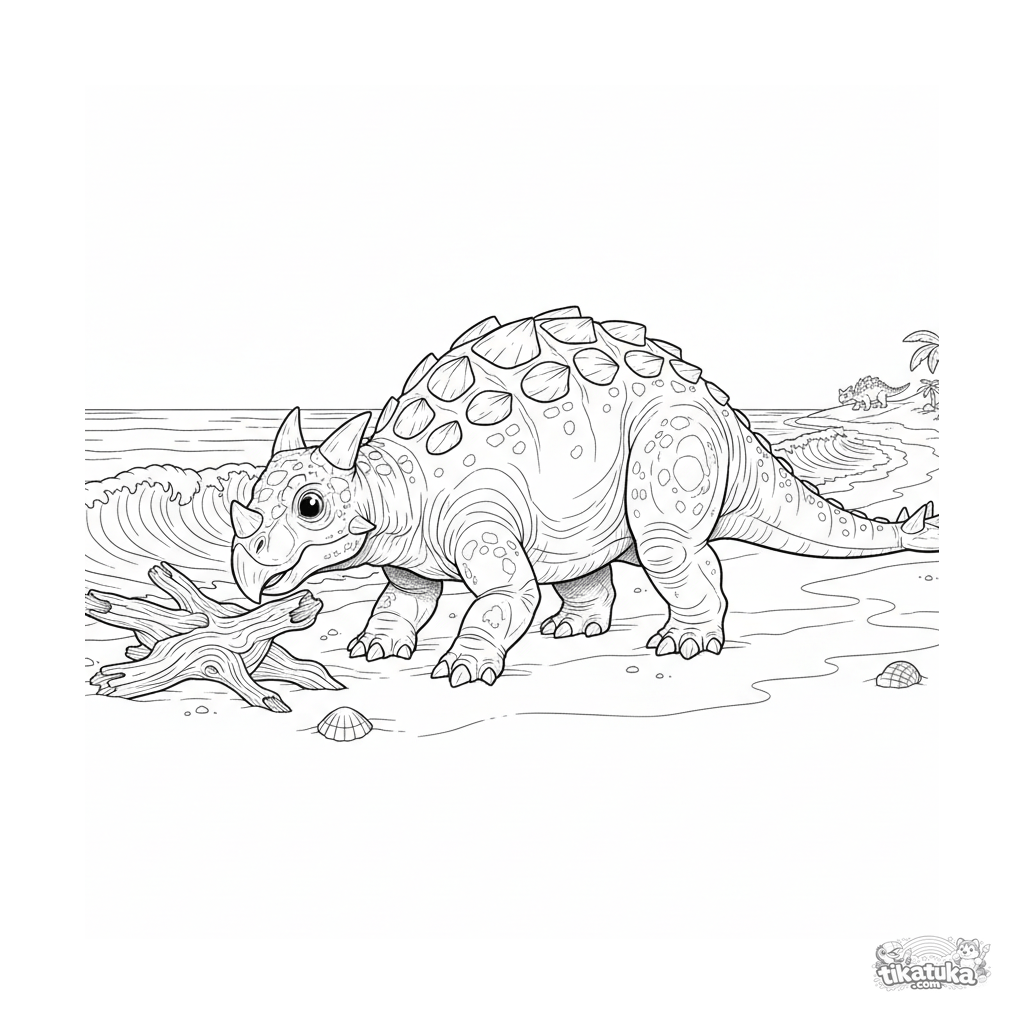 Página para colorear para 10-12 años: un anquilosaurio detallado explora la orilla de un océano antiguo, recolectando madera a la deriva.