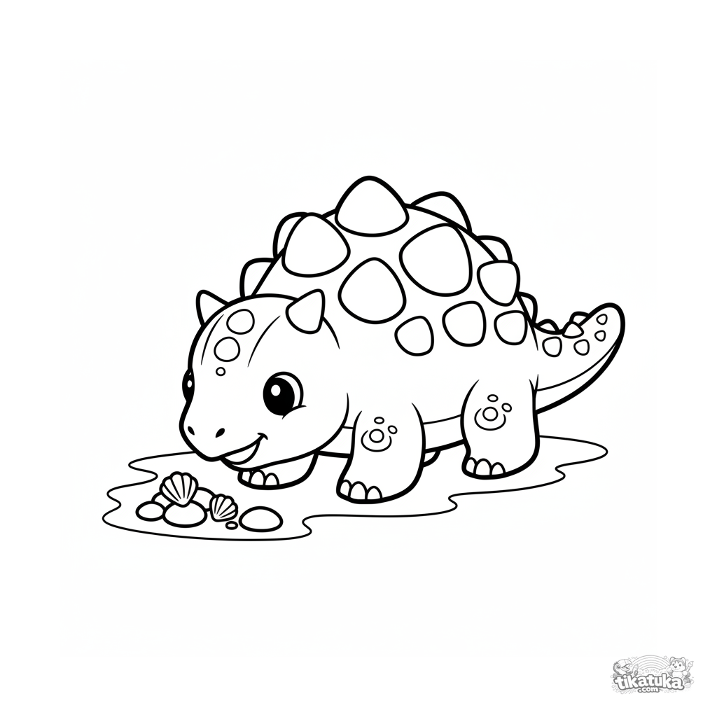 Página para colorear muy simple para niños pequeños 2-3: un gran anquilosaurio camina por una playa antigua recogiendo conchas. Formas grandes, márgenes amplios, detalles mínimos.