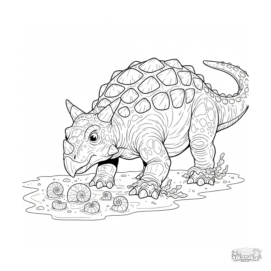 Página para colorear para 10-12 años: un anquilosaurus detallado excavando en busca de conchas en la orilla de un océano antiguo.