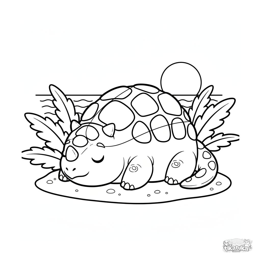 Página para colorear para niños pequeños 2-3 años: un gran y acogedor anquilosaurio dormitando en la arena cálida de una playa antigua. Formas simples y grandes.