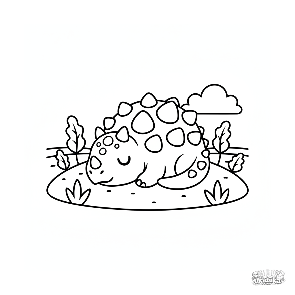 Página para colorear muy simple para toddlers 2-3: un anquilosaurus duerme en una duna de arena junto a un océano antiguo. Formas grandes, contornos gruesos, detalles mínimos.