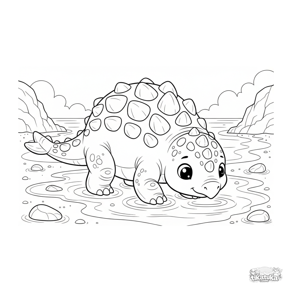 Página para colorear de un anquilosaurio en la playa arenosa de un océano antiguo. Para niños de 4 a 6 años. El dinosaurio explora la arena húmeda.