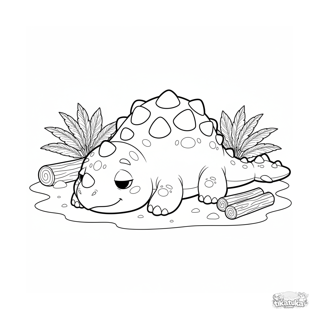 Página para colorear para niños de 7-9 años: un regordete anquilosaurio toma el sol pacíficamente en la arena caliente de una playa antigua. Escena acogedora y linda.