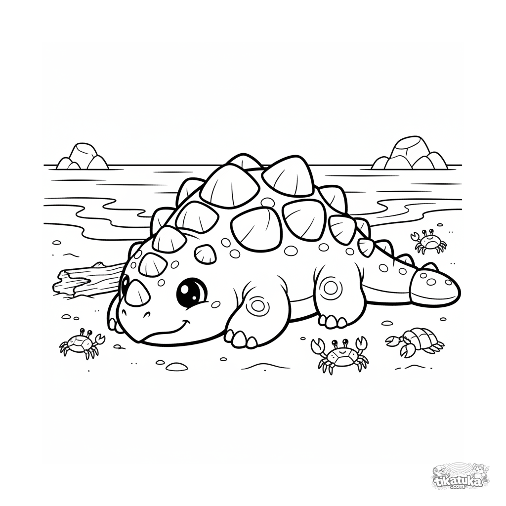 Página para colorear para 7-9 años: un anquilosaurio acorazado toma el sol pacíficamente en la playa arenosa de un océano antiguo. Escena serena con detalles de caparazón y madera flotante.