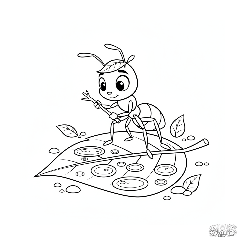 Página para colorear para 7-9 años: una hormiga inteligente con un gorro de hoja inspecciona charcos de rocío en una hoja, planeando una ruta. Escena dinámica y divertida del mundo de los insectos.