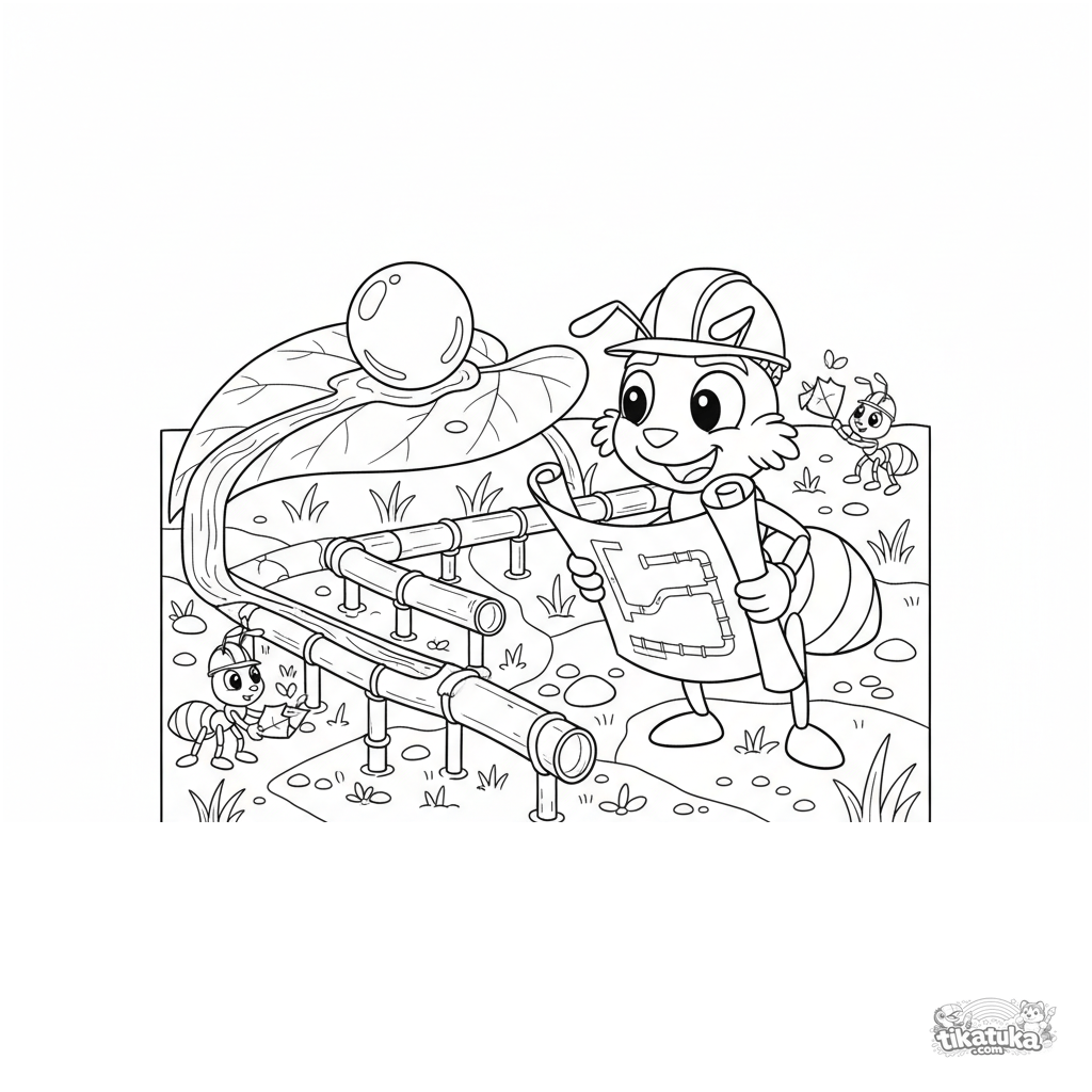 Página para colorear compleja para 10-12 años: una hormiga ingeniera dirige la construcción de un acueducto para una gota de rocío. Estilo técnico.