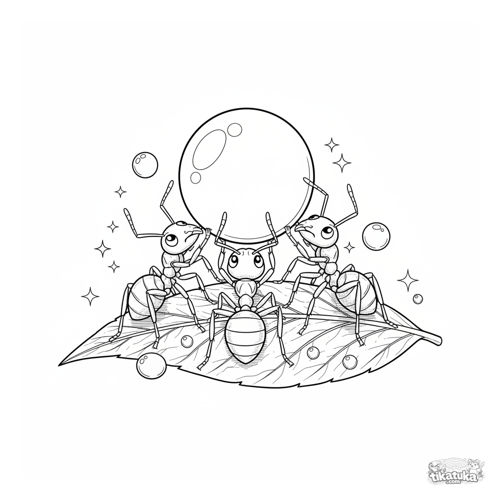 Página compleja para colorear para 10-12 años: tres hormigas trabajan juntas para llevar una gran gota de rocío por una hoja. Escena detallada de interacción.
