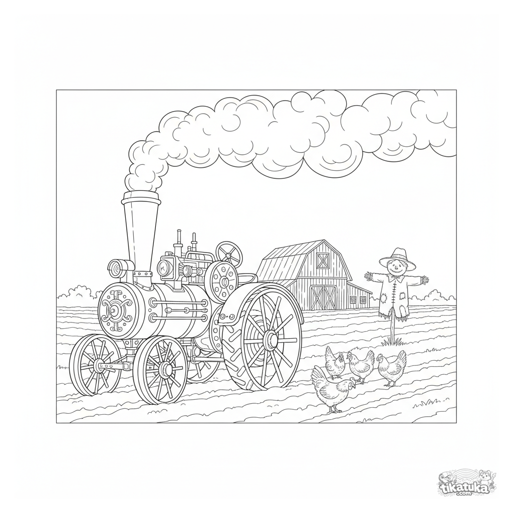 Página para colorear detallada de un tractor de vapor antiguo arando un campo. Para niños de 8 a 12 años. Estilo realista.