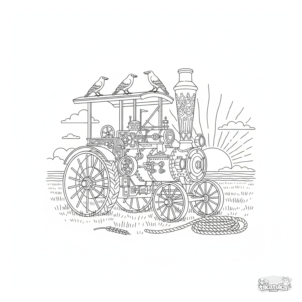 Página para colorear detallada de un tractor de vapor antiguo en un campo. Para niños de 8-12 años interesados en maquinaria.