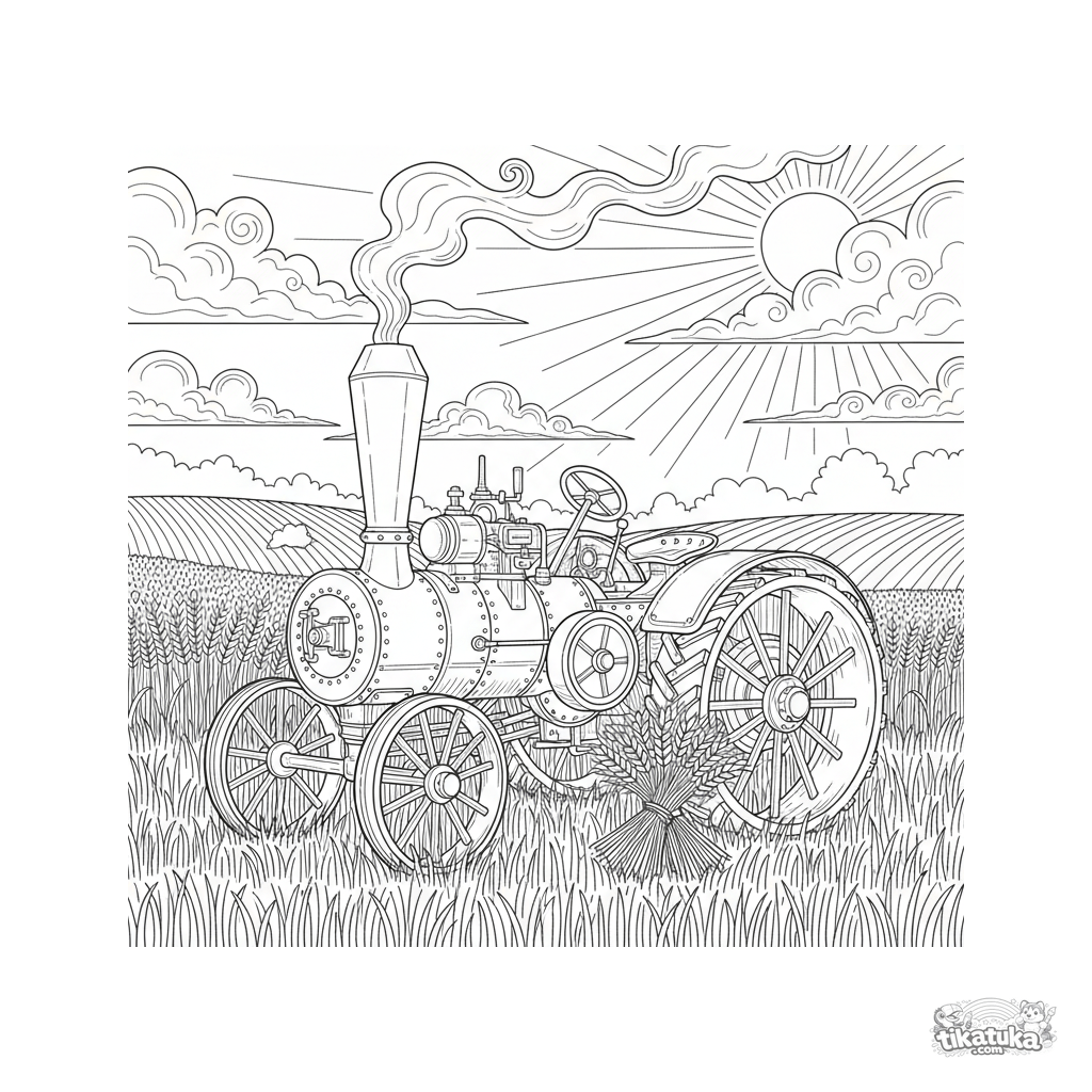 Página para colorear detallada de un tractor de vapor antiguo en un campo de trigo. Para niños de 8 a 12 años. Muchos detalles mecánicos y naturales.