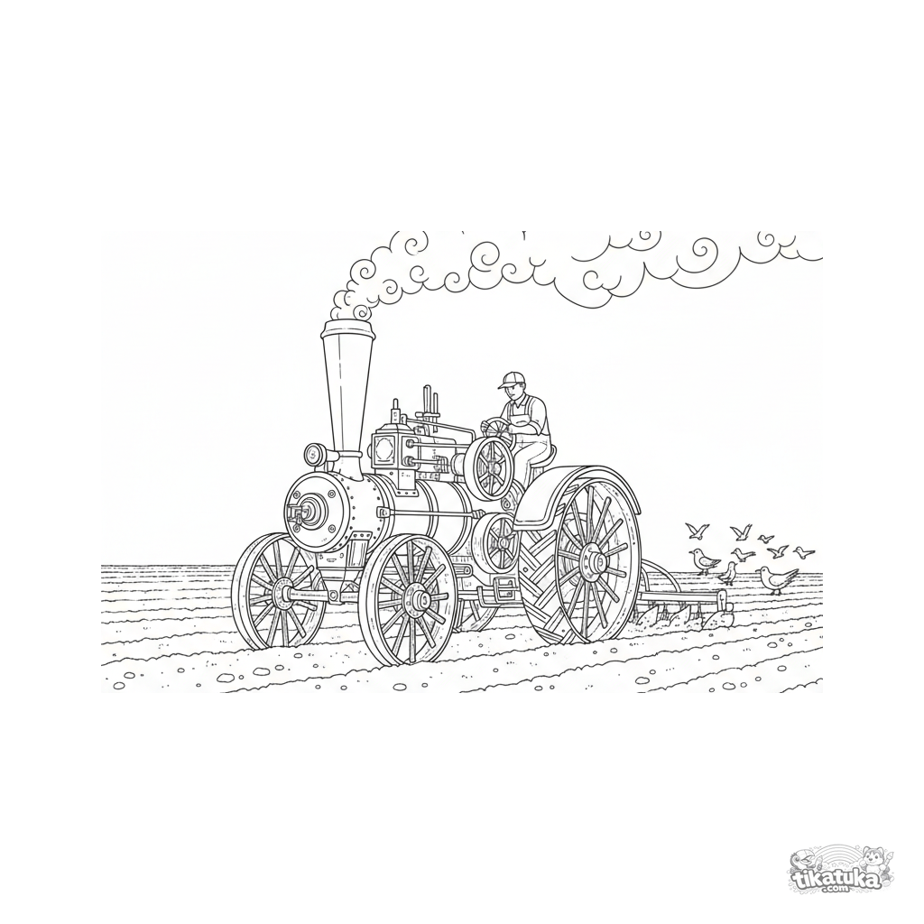 Página detallada para colorear de un tractor de vapor antiguo con ruedas de madera arando un campo. Para niños de 8 a 12 años.