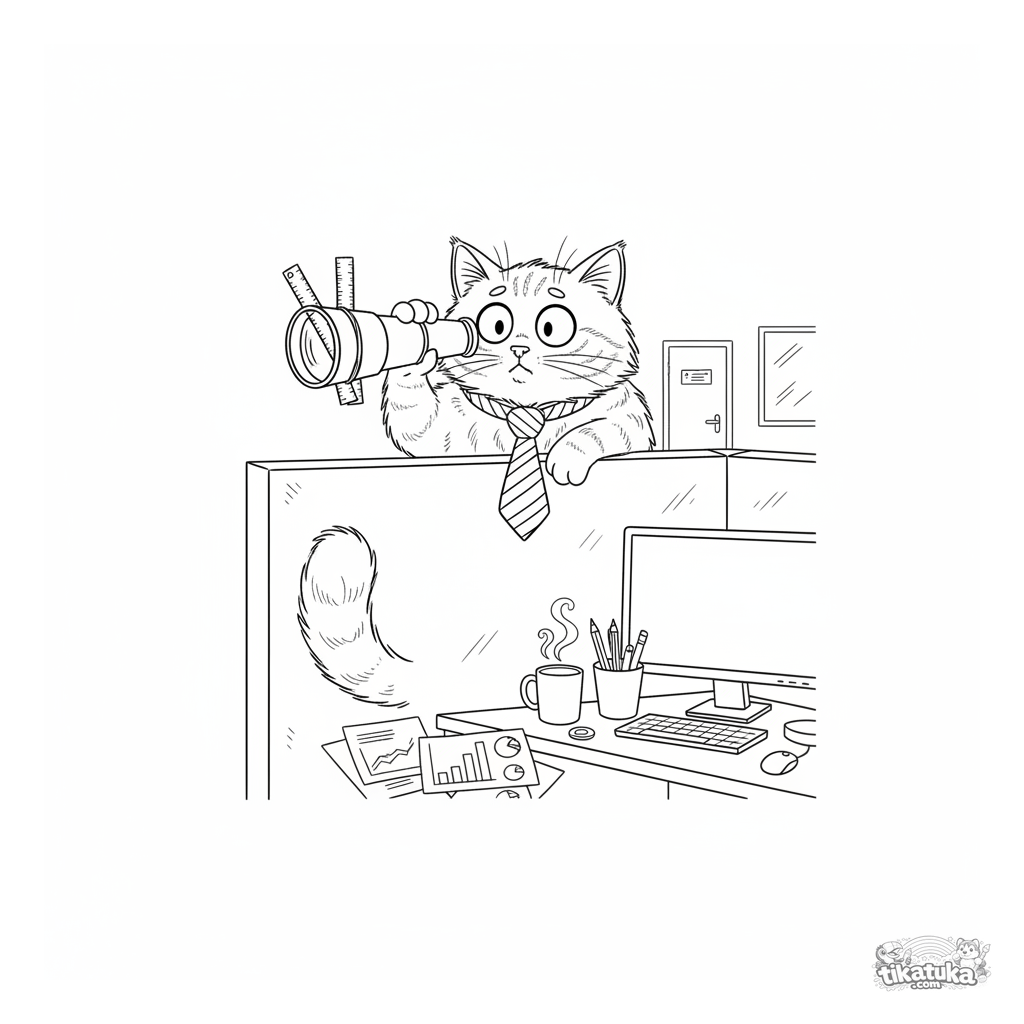 Página para colorear detallada para niños 10-12: un gato ansioso con corbata espía su salario con un periscopio casero en la oficina. Meme divertido y relatable con muchos detalles.