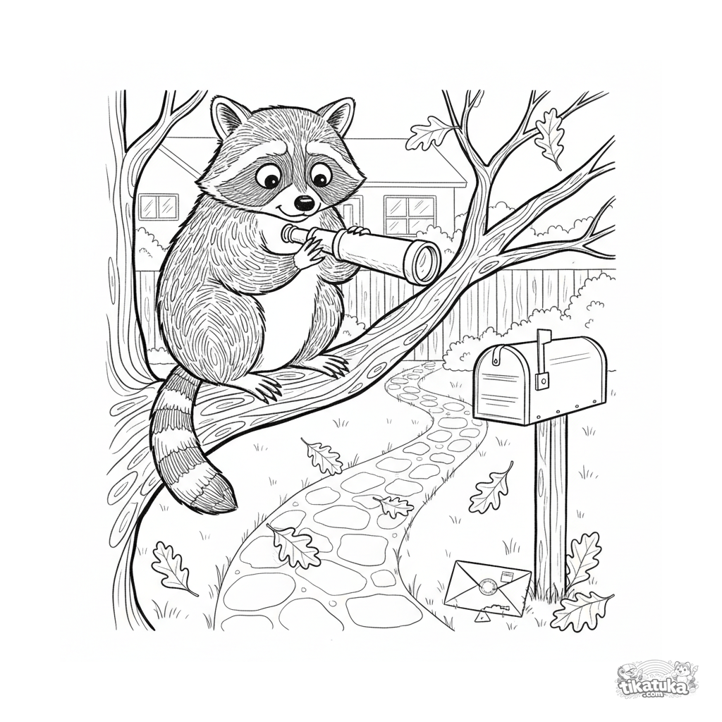 Página para colorear detallada para niños 10-12 años: un mapache ansioso con catalejo en un árbol observa un buzón, esperando el día de pago. Escena en estilo acuarela-boceto.