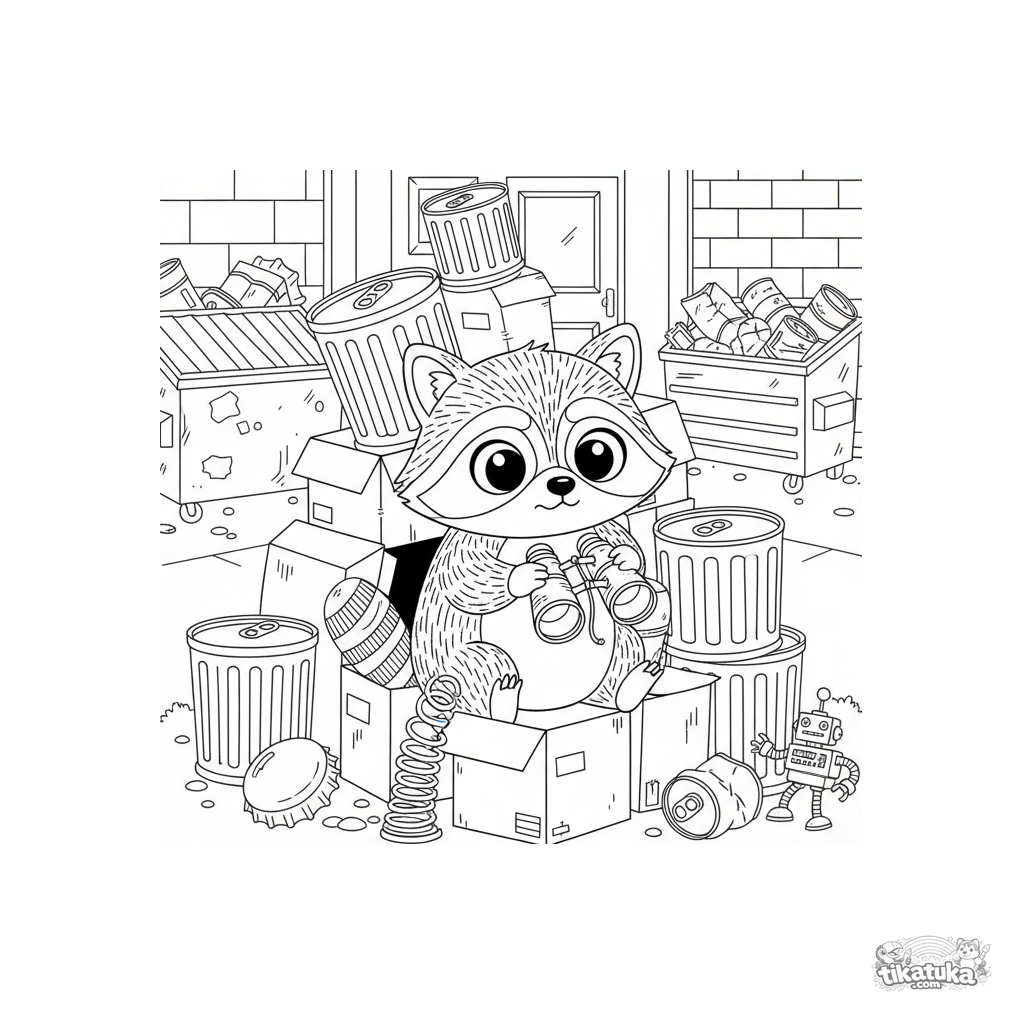 Página para colorear para niños 10-12: un mapache ansioso con prismáticos caseros asoma desde un fuerte de basura, vigilando un reparto. Escena graciosa detallada con estilo doodle.